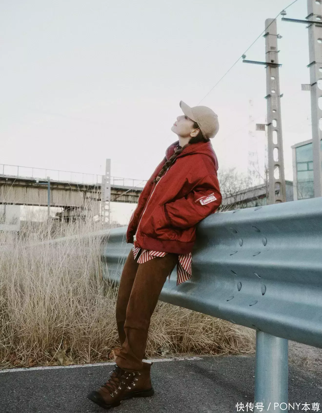 叠穿思路更是堪称教科书级:中间层的红白条纹衬衫露出领口与袖口,红白撞色与外层红色棉服形成呼应,既丰富了色彩层次,又为整体造型注入复古活力;衬衫的宽松版型与棉服的挺括形成材质碰撞,避免了叠穿的紧绷感。最内层的黑色高领衫作为基础款,既抵御了秋冬的寒意,又与外层的红色、中层的条纹形成经典三色搭配,黑白红的组合既和谐统一,又通过色彩差异展现出强烈的视觉张力,让三层叠穿不仅不显得厚重,反而更具层次感。